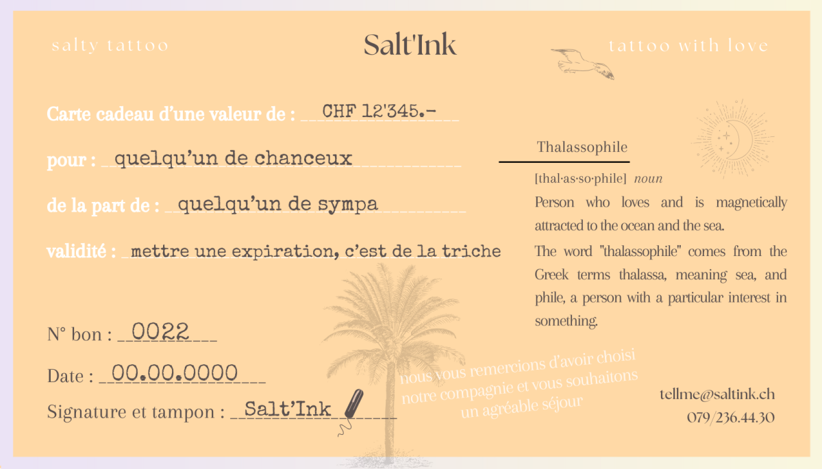 Valable pour un tattoo ou pour l'achat de produits dérivés signés Salt'Ink. β¨