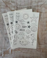Format carte postale (10 x 15 cm), tatouages à découper.
